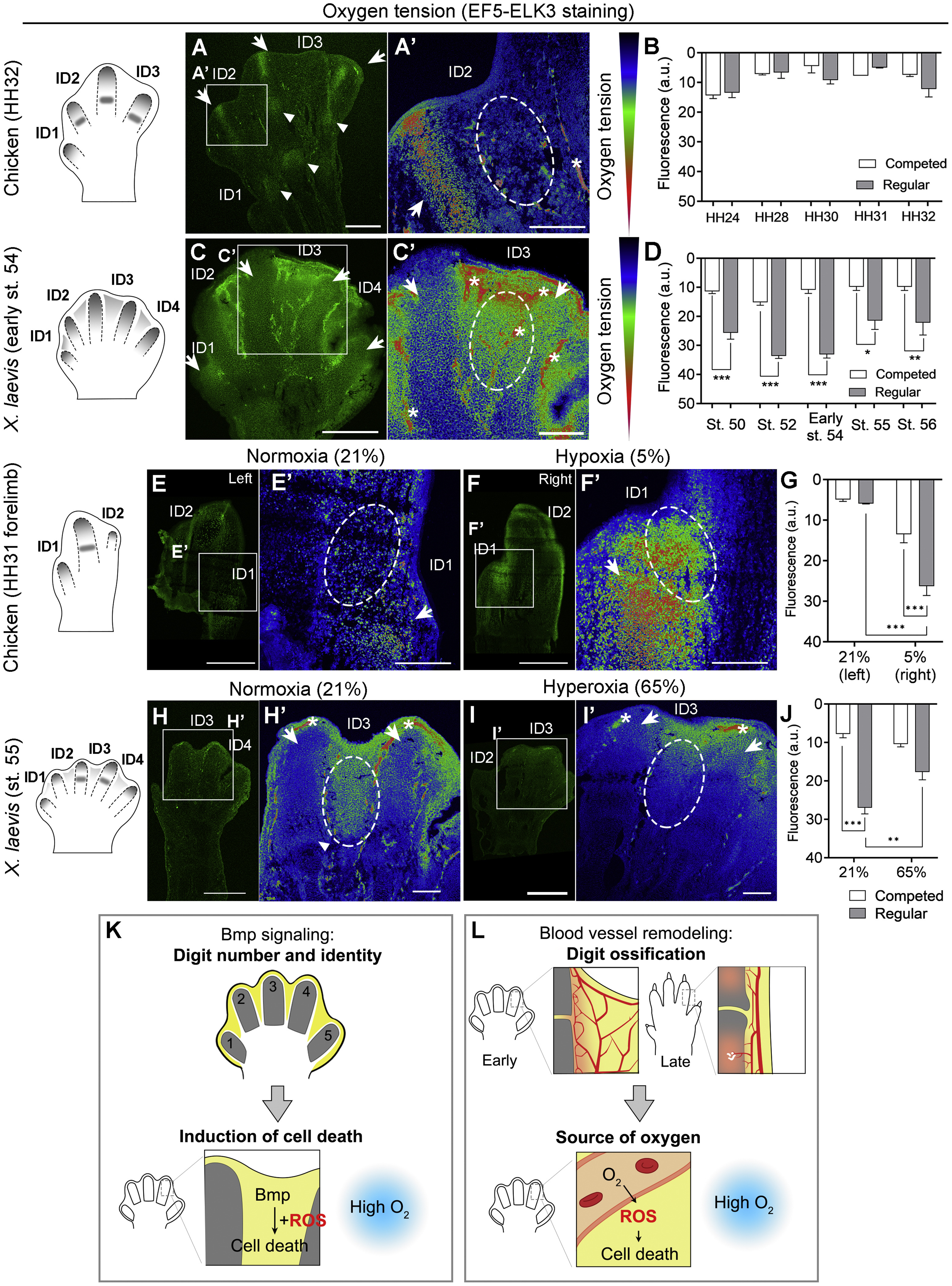 (H and I) EF5-ELK3 staining of stage 55 X. laevis incubated under hyperoxia (regular, n = 13; competed, n = 6) or normoxia (regular, n = 8; competed, n = 4). (H′) and (I′) Higher magnifications of the rectangles in (H) and (I) are shown in pseudocolor. Hyperoxia increased the oxygen tension in the interdigital region (dashed lines). The cartoon represents hypoxic regions in untreated limbs.