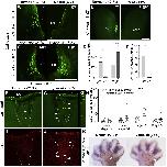 (B and C) Vasculature (fluorescent ink, upper panels) of early stage 54 wild-type (n = 5) and Prrx1-VegfA-EGFP hindlimbs (n = 6). Transgenic limbs have higher blood vessel density, as evidenced by manually tracing the blood vessels paths (bottom panels).