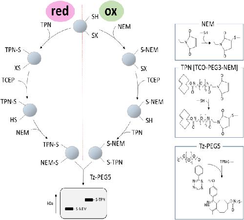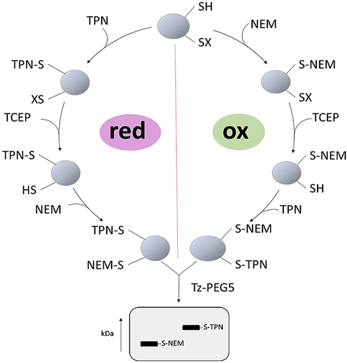 Fig. 1. Catalyst-free trans-cyclooctene-methyltetrazine (TCO-Tz) Click PEGylation schematic. The left side of the circle depicts the TCO-Tz Click PEGylation reduction (Click-PEGRED) protocol wherein reduced thiols are labelled with TCO-3 polyethylene glycol (PEG)-maleimide (TCO-PEG3-NEM, TPN); (2) before 6-methyltetrazine PEG 5 kDa (Tz-PEG5) is added to initiate the inverse electron demand Diels alder reaction and thereby mass shift reduced thiols. An optional Tris (2-carboxyethyl)phosphine hydrochloride (TCEP) reduction step to reduce reversibly oxidised thiols before labelling them with N-ethylmaleimide (NEM) is depicted. The right side of the circle depicts the TCO-Tz Click PEGylation oxidation (Click-PEGOX) protocol wherein (1) reduced thiols are labelled with NEM; (2) reversibly oxidised thiols are reduced with TCEP; (3) before being labelled with TCO-PEG3-NEM (TPN); and (4) 6 Tz-PEG5 is added to initiate the inverse electron demand Diels Alder reaction and thereby mass shift reversibly oxidised thiols. The insets on the far right depicts NEM mediated Michael addition (top), TPN mediated Michael addition to a reduced thiol (middle) and the inverse electron demand TCO-Tz Diels Alder reaction (bottom).