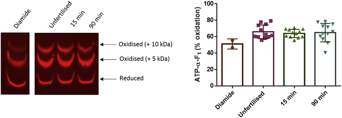 Fig. 3. ATP-α-F1is subject to substantial reversible oxidation before and after fertilisation in X. laevis. Left. Western blot image showing reversibly oxidised (i.e., mass shifted 5 and 10 kDa bands) relative to reduced ATP-α-F1 (bottom band) before and after (15 and 90 min) fertilisation in X. laevis. Right. Percent reversible ATP-α-F1 oxidation before (n = 12) and after fertilisation (n = 12) quantified. Each n = a pool of 5 eggs/embryos. The positive control refers to a diamide (50 mM for 30 min) treated sample. A one way ANOVA revealed no significant differences between time-points (P = 0.8306).