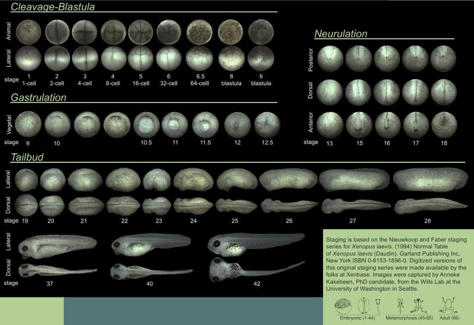 In this figure, we present a staging series for embryonic Xenopus tropicalis. Stages were broken into four major modules: cleavage, gastrulation, neurulation, and tailbud stages. Both animal and lateral views are shown to highlight the appearance of animal blastomeres as well as the pigment distinctions between animal and vegetal blastomeres. Gastrulation is shown as a continuum from stages 9 to 12.5. Neurulation comprises stages 13 to 18, and staging of this process is primarily predicted from lateral proximity of neural folds to one another in the dorsal view and closure of neural folds in the anterior view. When the neural fold finishes zippering, the embryo begins to elongate. During early tailbud stages (19â24) the embryo develops morphologically wellâdefined anterior structures including the pharyngeal arches, sensory placodes, and eyecup, while elongating along the anteriorâposterior axis. Elongation, development of tailfin, resecting of gut, and development of refined organs then takes place over the rest of tailbud and early tadpole development. The lateral view is best used for staging by looking at the gut morphology, eye morphology, and body elongation. The dorsal view is best used to look at development of arches and elongation