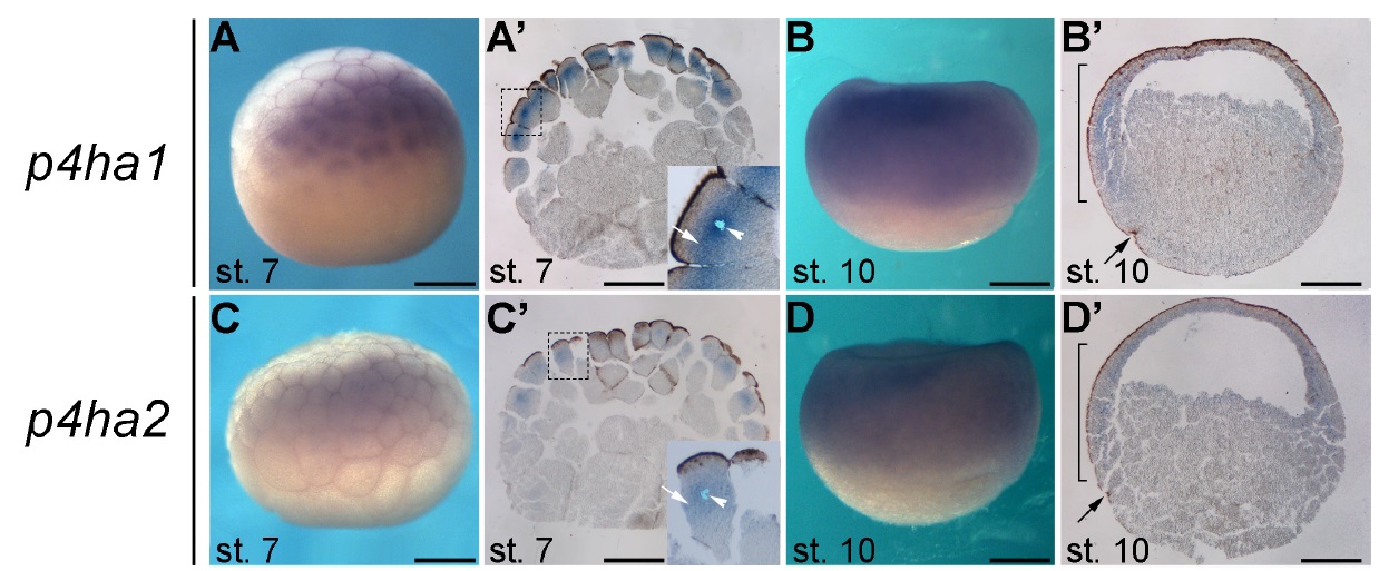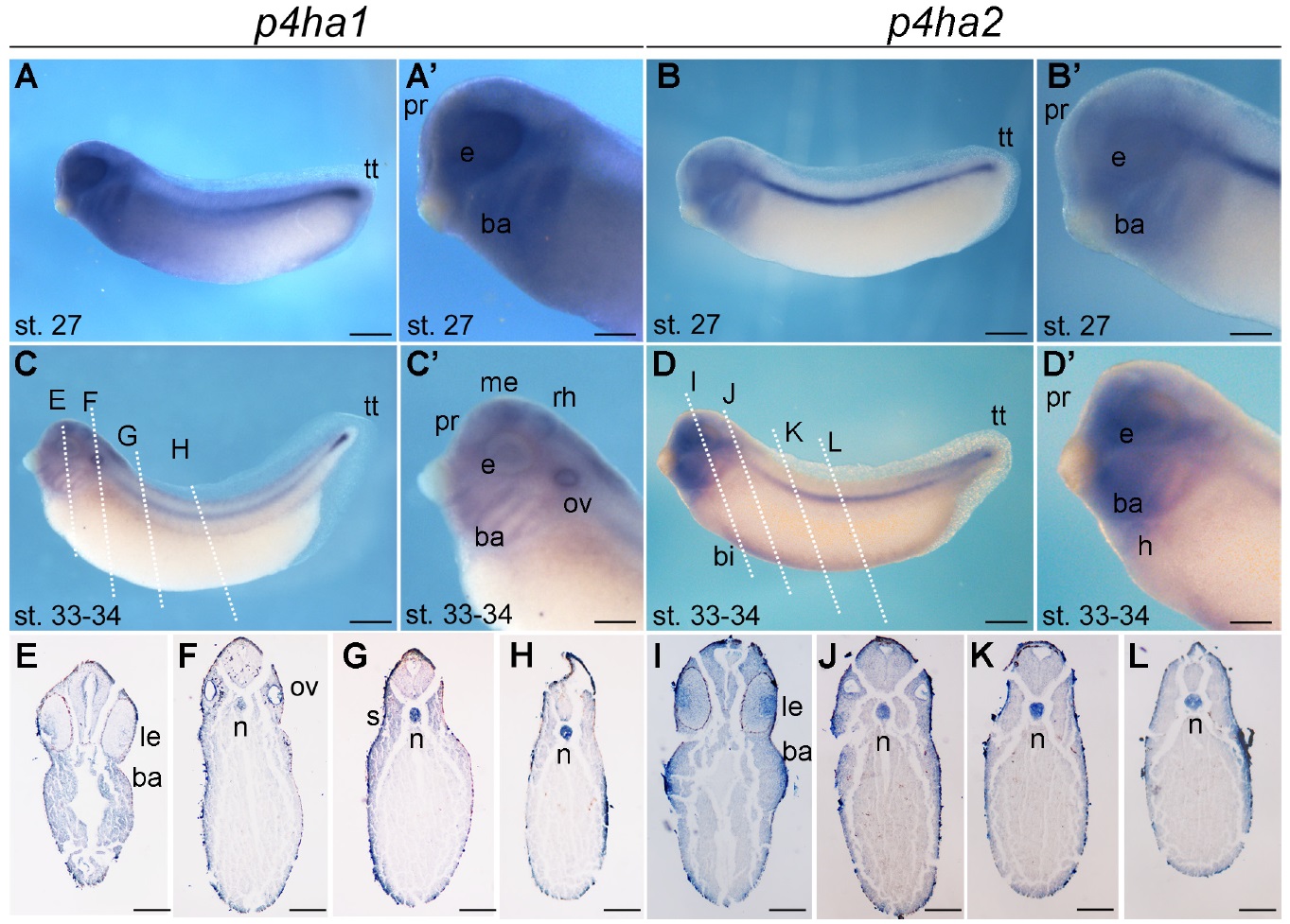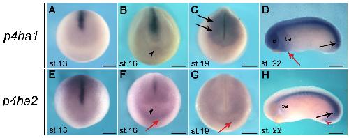 Xenopus development. (A) p4ha1 and p4ha2 expression
