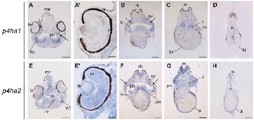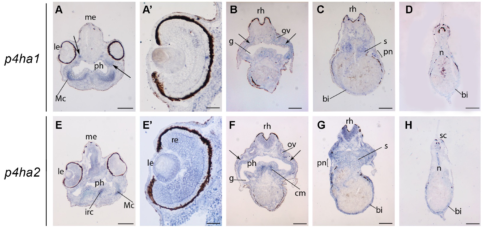 p4ha2. Abbreviations: Bi, blood islands; cm, cranial muscles; g, gill chamber; irc, infrarostral cartilage; le, lens; Mc, presumptive Meckelâs cartilage; me,