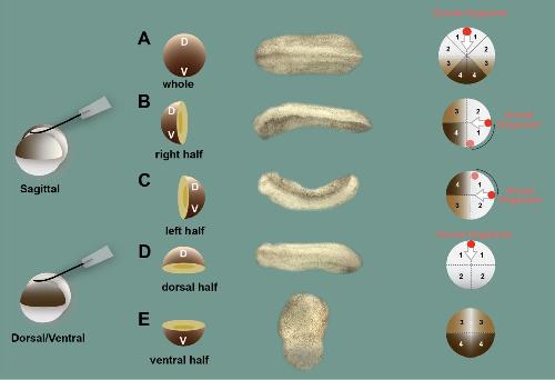 showing almost perfect scaling of the half embryo along the antero-posterior axis. (E) Ventral half embryo; because it lacks the Spemann organizer