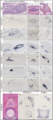 Fig. 3. Histology and in situ hybridization on cryosections of catshark Scyliorhinus canicula skeletal tissues at stage 33. (A, B, C, V) HematoxylinâEosinâSaffron (HES) histological staining. (DâU) Expression of Col10a1 duplicates in developing teeth and scales of catshark detected with probes specific for each duplicate. Dotted lines indicate the mesenchymal compartment limits. Asterisk marks the mineralizing matrix, often seen as empty space due to decalcification. (W, X) Expression of Col10a1.4 duplicate in comparison to Col2a1 in mineralizing vertebral tissues of catshark. Black arrowhead in the neural arch points to the site of globular mineralization; open arrowhead points to the site of lamellar mineralization; black arrowhead in the vertebral body points to the site of fibrous mineralization. Scale bars: 50âµm (AâU), 200âµm (VâX). Abbreviations: mat. amel., maturation stage ameloblasts; Mâs, Meckelâs cartilage; notoch, notochord; od., odontoblasts; sec. amel., secretory ameloblasts.