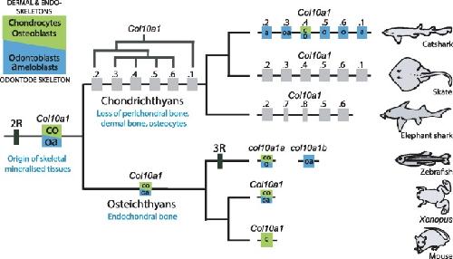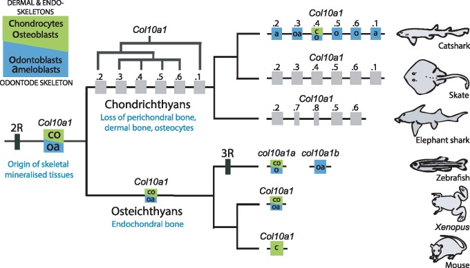 Fig. 5. Proposed scenario for Col10A1 locus evolution and subfunctionalization. Col10a1 genes with expression in dermal skeleton and/or endoskeleton are marked as green boxes, with expression in odontode skeleton are marked as blue boxes and with unknown expression are marked by gray boxes. Tandem duplication of Col10a1 genes in chondrichthyan ancestor is explained in detail in supplementary figure 2 (Supplementary Material online).