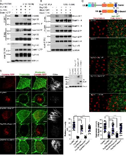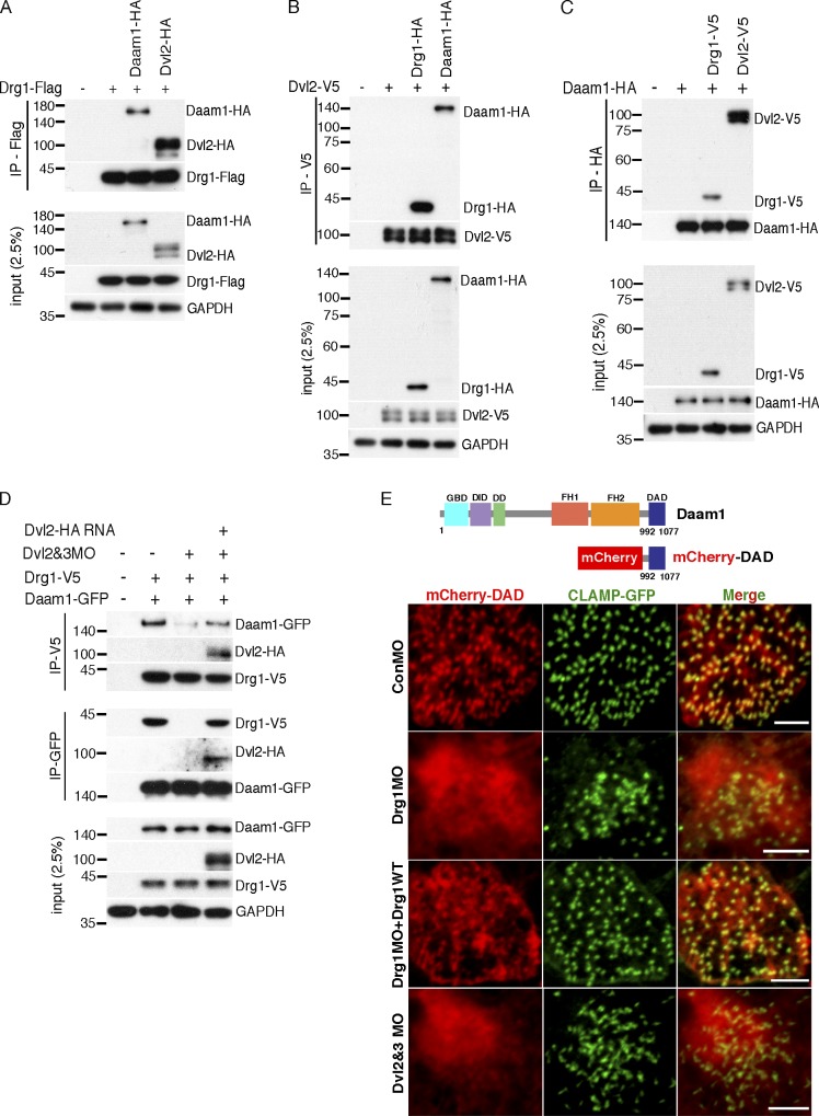 Figure 6. Drg1 is required for DvlâDaam1 signaling in MCCs. (AâC) The affinity of protein interactions among Drg1, Dvl2, and Daam1 were tested by IP with the adjusted expression levels of two proteins tagged with the same epitope while expressing the other binding partner tagged with a different epitope. The indicated mRNAs were injected at the one-cell stage, and co-IPs were performed using embryos at stage 12. (D) The Drg1âDaam1 interaction is disrupted by Dvl knockdown. Drg1-V5 and Daam1-GFP mRNAs were coinjected with Dvl2 and Dvl3 MOs and/or Dvl2-Flag (MO resistant) mRNA, and co-IPs were performed with embryos harvested at stage 20. The reduced interaction between Drg1 and Daam1 is restored by Dvl2-Flag expression. (E) mCherry-DAD and GFP-CLAMP mRNAs were coinjected with the indicated mRNAs and MOs, and MCCs of embryos at stage 25 were observed. The close location of mCherry-DAD to CLAMP-GFP was disrupted by Drg1 or Dvl knockdown in MCCs. Images were generated by maximum intensity projection of serial z-stack confocal images from surface to subapical regions (up to â2 µm). Scale bars, 5 µm. DD, dimerization domain; DID, diaphanous inhibitory domain; FH1, formin homology 1; FH2, formin homology 2; GBD, GTPase-binding domain. |