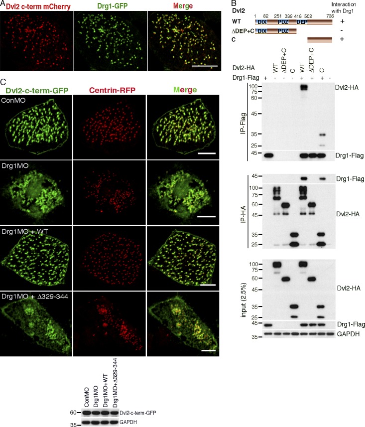 Figure 5. Drg1 knockdown has a mild effect on Dvl localization to the basal body region in MCCs. (A) Drg1 colocalizes with the Dvl2 C terminus in MCCs. The mRNAs of the Dvl2 C-terminal fragment tagged with mCherry and Drg1-GFP were coinjected into both marginal ventral blastomeres of four-cell-stage embryos and fixed at stage 25. Images are generated by maximum intensity projection of serial z-stack confocal images. Scale bar, 10 µm. (B) The C-terminus of Dvl2 associates with Drg1. The indicated HA-tagged Dvl2 mutants were coexpressed with Drg1-Flag, and co-IP was performed. (C) Drg1 knockdown diminishes Dvl2 C-terminal localization to the basal body area. mRNAs of Dvl2-c-term-GFP and centrin-RFP (basal body marker) were coinjected with the indicated MOs and mRNAs. The expression level of Dvl2-c-term-GFP was tested by Western blot. Embryos were fixed at stage 25â27. Serial z-stack images were generated. A maximum intensity projection image is shown. Scale bars, 5 µm. |