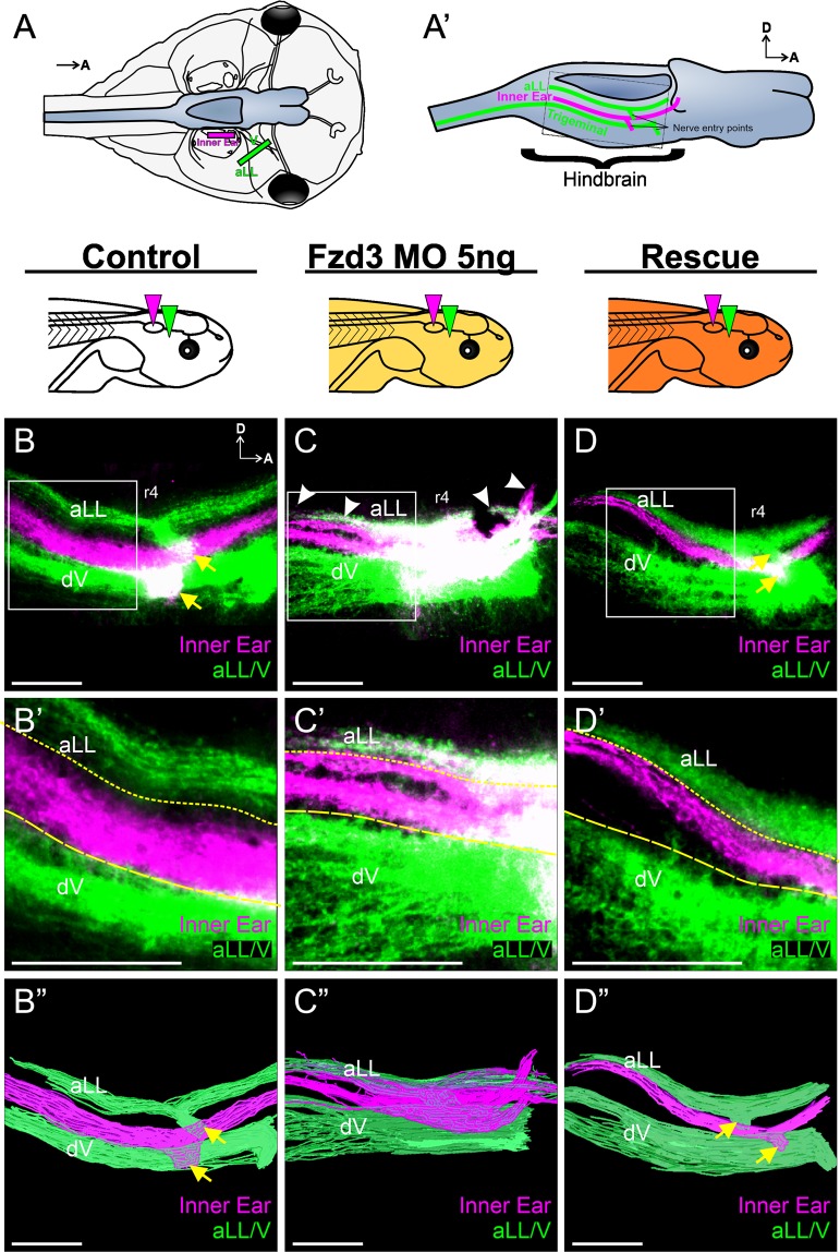 Figure 1. Xenopus vestibular afferents display aberrant central projections following Fzd3 knockdown. (A) Schematic showing a dorsal view of a stage 46 Xenopus laevis tadpole and location of lipophilic dye placement. Lipophilic dyes were implanted into the ear (magenta) and into the anterior lateral line (aLL) and trigeminal (V) nerves (green). Brain is colored blue. (Aâ) Schematic showing a side view of a brain highlighting the location of the central projections from anterior lateral line (aLL), inner ear, and trigeminal afferents that would be labeled from the dye placement in (A) Dotted box represents the approximate area imaged. Confocal images of hindbrains from control animals (nâ=â6) (B), of animals injected with 5âng Fzd3 morpholino (nâ=â12) (C), and of rescue animals injected with 5âng Fzd3 morpholino plus 500âpg mouse Fzd3 mRNA (nâ=â9) (D). White arrowheads indicate aberrant projections. Yellow arrows indicate nerve entry points. (BââDâ) Higher magnification of boxed areas in (BâD). Short-dash and long-dash yellow lines represent the approximate ventral boundary of the anterior lateral line afferent projections and dorsal boundary of the trigeminal afferent projections, respectively. (BââDâ) Three-dimensional reconstructions of entire confocal stacks shown in (BâD). r4, rhombomere 4; dV, descending trigeminal tract; D, dorsal; A, anterior. Orientation for panels (BâDâ) as in (B) Diagrams represent treatment (white, control; gold, Fzd3 morpholino; orange, Fzd3 morpholino plus Fzd3 mRNA) and colored wedges represent lipophilic dye placement (magenta, inner ear; green, lateral line and trigeminal nerves). Scale bars represent 100âµm. |