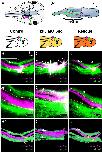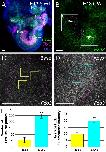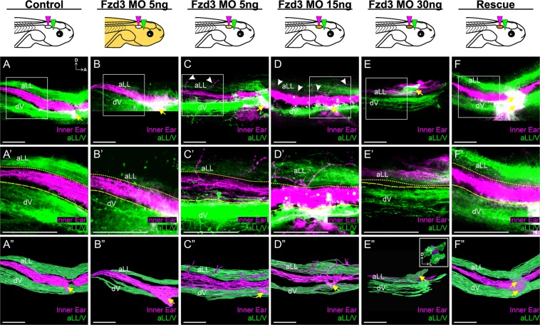 Figure 2. Xenopus vestibular afferents display aberrant central projections in a dose-dependent manner following Fzd3 knockdown in only the ear and associated inner ear afferents. Ears from control/wild type X. laevis embryos were transplanted to replace the ear of animals injected with Fzd3 morpholino (B,B”). Note the inner ear central projections (magenta) were between the lateral line and trigeminal projections (green), comparable to control animals (A,A”). In contrast, ears from X. laevis embryos injected with various concentration of Fzd3 morpholino transplanted to replace the ear of control animals (C–E) showed variable variations in inner ear central projections that could be rescued by an addition of mouse Fzd3 mRNA (F,F”). (A) Control X. laevis (n = 6), (B) animals injected with 5 ng Fzd3 morpholino with an ear transplanted from a control animal (n = 7), (C) control animals with an ear transplanted from an animal injected with 5 ng Fzd3 morpholino (n = 6), (D) control animals with an ear transplanted from an animal injected with 15 ng Fzd3 morpholino (n = 5), (E) control animals with an ear transplanted from an animal injected with 30 ng Fzd3 morpholino (n = 2), (F) control animals with a “rescue” ear transplanted from an animal injected with 5 ng Fzd3 morpholino plus 500 pg mouse Fzd3 mRNA (n = 6). White arrowheads indicate aberrant projections. Yellow arrows indicate nerve entry points. (A’–F’) Higher magnification of boxed areas in A-F. Short-dash and long-dash yellow lines represent the approximate ventral boundary of the anterior lateral line afferent projections and dorsal boundary of the trigeminal afferent projections, respectively. (A”–F”) Three-dimensional reconstructions of entire confocal stacks in A-F. (E” Inset) Anterior view of E”. dV, descending trigeminal tract; D, dorsal; A, anterior; L, lateral. Orientation for all panels as in A, except for E” inset. Diagrams represent treatment (white, control; gold/brown, Fzd3 morpholino; orange, Fzd3 morpholino plus Fzd3 mRNA) and colored wedges represent lipophilic dye placement (magenta, inner ear; green, lateral line and trigeminal nerves). Scale bars represent 100 µm. |