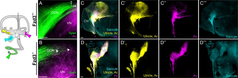 Figure 3. Mouse vestibular neurons display aberrant central projections in the absence of Fzd3. Lipophilic dyes were placed into individual sensory epithelia (cochlear apex, green; posterior crtista, magenta; saccule, cyan; utricle/anterior crista, yellow) of two Fzd3+/− control (A,C) and two Fzd3−/− mutant (B,D) mice at E18.5. All panels are coronal brain sections. (A,B) are a stack of Z-series images; (C,D) are single optical sections. DCN, dorsal cochlear nucleus; CN, cochlear nucleus; VN, vestibular nucleus; Pc, posterior crista; Ac, anterior crista; D, dorsal; M, medial. Orientation for all panels as in A. Scale bars represent 100 µm. |