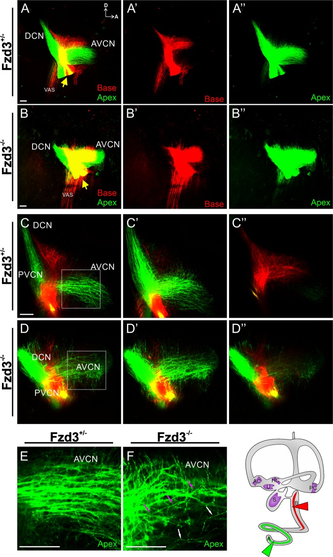 Figure 4. Mouse spiral ganglion neurons display aberrant central projections in the absence of Fzd3. Lipophilic dyes were placed into the base (red) and apex (green) of Fzd3+/− control cochlea (A,C,E) and Fzd3 null mutants (B,D,F) at E18.5. A two dimensional rendering of a stack of images taken through the cochlear nuclei complex (A,B) shows more overlap of base and apex projection in the mutant compared to control. Yellow arrows indicate nerve entry points. (C,D) Single optical sections showing normal divergence to the AVCN and DCN as well as segregation between afferents from the base and apex in controls and a more profound projection to the PVCN of the apex of Fzd3 mutant mice. (E,F) Higher magnification of a single optical section showing fibers running parallel to each other in a single direction in the AVCN in a control. In contrast, there was aberrant trajectory of afferents in the AVCN in Fzd3 mutants and single fibers can be observed projecting across multiple other afferents (D,F). Magenta arrows show the course of a single fiber as it projects. White arrows show fibers projecting in the wrong direction (ventrally) (F). AVCN, anteroventral cochlear nucleus; DCN, dorsal cochlear nucleus; PVCN, posteroventral cochlear nucleus; VAS, ventral acoustic stria; D, dorsal; A, anterior. Orientation for all panels as in (A) Scale bars represent 100 µm. Two control and Four mutant animals were examined. |