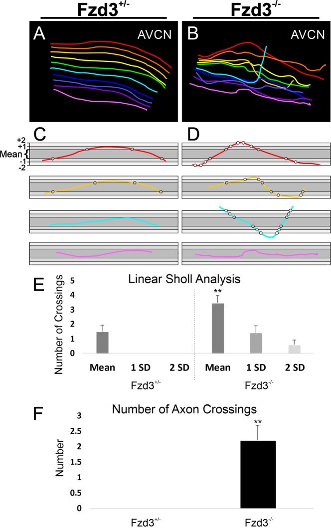 Figure 5. Analysis of spiral ganglion neuron central projections following loss of Fzd3. (A) Reconstruction of ten approximately equally spaced afferents in Fig. 4E. (B) Reconstruction of ten approximately equally spaced afferents in 4F. (C,D) Selected individual axon tracings from a Fzd3+/− control mouse (C) and a Fzd3−/− mutant mouse (D), both at E18.5, overlaid onto boxes representing the mean dorsoventral limit of all control axons (dark gray), plus or minus one standard deviation (1 SD, medium gray), and plus or minus two standard deviations (2 SD, light gray) to display the analysis. Grayscale circles indicate mean/SD level crossings. (E) Linear Sholl analysis of 20 axons each from Fzd3+/− and Fzd3−/− mice. Bars represent means and standard error of the means for the number of times axons crossed the mean, one standard deviation (1 SD), and two standard deviation (2 SD) boundaries in (C,D). (F) Mean number of times an axon crossed over another axon from an analysis of 20 axons each from Fzd3+/− and Fzd3−/− mice. Error bars represent standard error of the means. **p < 0.01. |