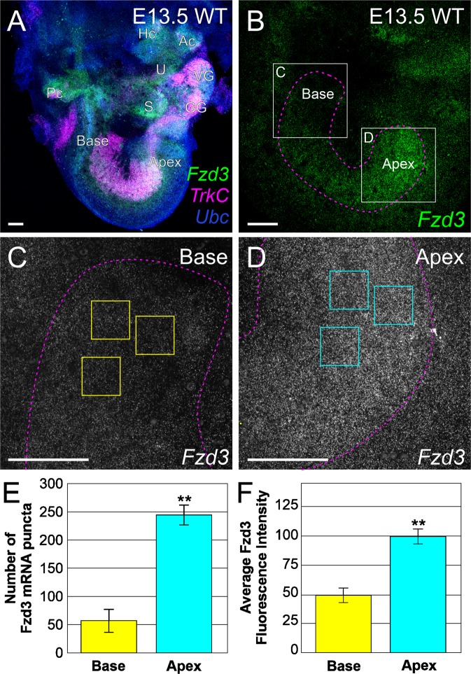 Figure 6. Fzd3 is expressed as a gradient across the cochlea in auditory neurons. (A) Overview of a wildtype E13.5 ear following RNAscope® fluorescent in situ hybridization showing expression of Fzd3 (green), TrkC (expressed in auditory neurons, magenta), and Ubc (Ubiquitin C, control, blue). Individual puncta represent a single mRNA. U, utricle; S, saccule; Ac, anterior crista; Hc, horizontal crista; Pc, posterior crista; VG, vestibular ganglion; GG, geniculate ganglion. (B) Fzd3 expression at E13.5 in the spiral ganglion showing higher levels of expression in the apex compared with the base. The image shows the collapsed stack of the entire spiral ganglion. The spiral ganglion was outlined following the boundary of TrkC expression (magenta dotted outline). (C) Fzd3 expression in basal afferents (boxed area in B). (D) Fzd3 expression in apical afferents (boxed area in B). C and D were imaged using identical confocal settings. (E) Quantification of individual Fzd3 mRNA puncta in the base and apex following RNAscope®. Puncta were counted with ImageJ software in each of three equal sized squares (50 µm × 50 µm) per region (see yellow/cyan boxes in C and D) in a central Z series image for the base and for the apex of each animal following thresholding. Three animals were quantified. (F) Quantification of fluorescent intensity of Fzd3 mRNA in the base and apex following RNAscope®. Average intensity was determined for each of three equal sized squares (50 µm × 50 µm) per region (see yellow/cyan boxes in C and D) in the collapsed Z series for the base and for the apex of each animal. Three animals were quantified. Error bars represent standard error of the means. **p < 0.01. |