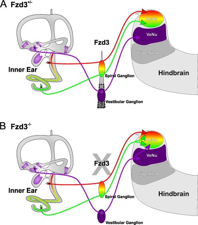 Figure 7. Hypothesis for guidance of inner ear afferents by Fzd3. We predict that the Fzd3 gradient expressed along the cochlear neurons is, in part, responsible for correct targeting to the proper dorsoventral target within the hindbrain. (A) In the absence of Fzd3, there is no gradient across cochlear neurons and thus dorsoventral targeting is disrupted. (B) Whether this gradient extends to the vestibular neurons remains to be explored. |