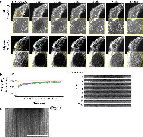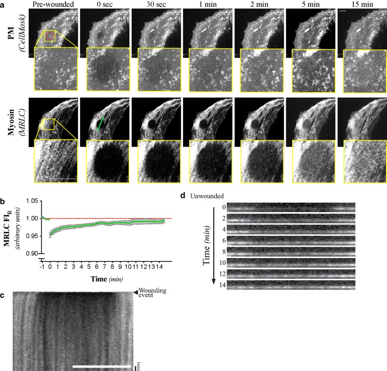 Fig. 2. Mammalian single-cell repair does not involve myosin enrichment at the wound borders. a Maximum intensity projections of selected micrographs of the CellMask and MRLC signals following laser-mediated ablation of the PM of HeLa cells. b Normalized MLRC fluorescent signal intensity (MRLC FIR) at the wound site relative to control regions. Mean and SEM shown of n = 12 cells. c Kymograph of the MRLC signal before and after laser-mediated ablation of the PM. Cell and targeted area is the same as in the one shown in a. d Resliced cortical volume (each 10 μm) of selected time-points of the wounding assay shown in a, c. Targeted area (95 μm2) is represented by the red circle found on the pre-wounded, PM micrograph. The line scan region used for the creation of the kymograph and resliced volumes correspond to the cyan line (22 μm) displayed on the 0 s, MRLC micrograph. The cell shown in a, c, and d is representative of n = 12 wounding assays, all of which were used to prepare b. Scale bars = 10 μm