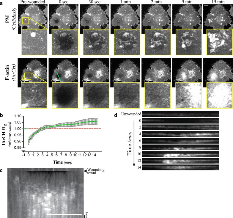 Fig. 1. F-actin is enriched at the wound site following laser-mediated ablation of the PM. a Maximum intensity projections of selected micrographs of the CellMask and UtrCH signals following laser-mediated ablation of the PM of HeLa cells. b Normalized UtrCH fluorescent signal intensity (UtrCH FIR) at the wound site relative to control regions. Mean and SEM shown of n = 37 cells. c Kymograph of the UtrCH signal before and after laser-mediated ablation of the PM. Cell and targeted area is the same as in the one shown in a. d Resliced cortical volume (each 10 μm) of selected time-points of the wounding assay shown in a, c. Targeted area (95 μm2) is represented by the red circle found on the pre-wounded, PM micrograph. The line scan region used for the creation of the kymograph and resliced volumes correspond to the cyan line (22 μm) displayed on the 0 s, UtrCH micrograph. The cell shown in a, c, and d is representative of n = 37 wounding assays, all of which were used to prepare b. Scale bars = 10 μm