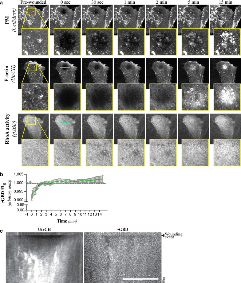 Fig. 3. RhoA activity is increased the over entire area of the wound-site. a Maximum intensity projections of selected micrographs of the CellMask, UtrCH, and γGBD signals following laser-mediated ablation of the PM of HeLa cells. b Normalized γGBD fluorescent signal intensity (γGBD FIR) at the wound site relative to control regions. Mean and SEM shown of n = 12 cells. c Kymographs of the UtrCH and γGBD signals before and after laser-mediated ablation of the PM. Cell and targeted area is the same as in the one shown in a. Targeted area (95 μm2) is represented by the red circle found on the pre-wounded, PM micrograph. The line scan region used for the creation of the kymograph correspond to the cyan line (22 μm) displayed on the 0 s, γGBD micrograph. The cell shown in a, c is representative of n = 12 wounding assays, all of which were used to prepare b. Scale bars = 10 μm