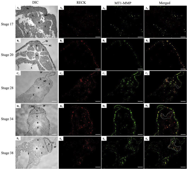 Fig. 1. Localization of RECK and MT1-MMP proteins during early X. laevis development. Immunohistochemistry was performed using Alexa Fluor 555-labeled anti-RECK (red) and Alexa Fluor 488-labeled anti MT1-MMP (green) antibodies on stage 17â38 embryos. Brightfield DIC images are shown on the left panels. Mono-colour images for RECK and MT1-MMP are presented individually. Colocalization of RECK and MT1-MMP (yellow) is indicated on the right panels. Dotted line in stage 28 merged image indicates overlapping signal within the middle of somites. Dashed line in stages 34 and 38 merged images indicates overlapping signal along the ventral neural tube. Scale barâ¯=â¯100 μm. Abbreviations: Eâ¯=â¯endoderm, Epâ¯=â¯epidermis, Dâ¯=â¯dorsal NT, DFâ¯=â¯dorsal fin, Nâ¯=â¯notochord, NCâ¯=â¯neural crest, NPâ¯=â¯neural plate, NTâ¯=â¯neural tube, Sâ¯=â¯somitic mesoderm, Vâ¯=â¯ventral NT.
