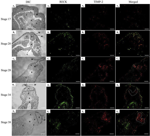 Fig. 2. Localization of RECK and TIMP-2 proteins during early X. laevis development. Immunohistochemistry was performed using Alexa Fluor 488-labeled anti RECK (green) and Alexa Fluor 555-labeled anti-TIMP-2 (red) antibodies on stage 17â38 embryos. Brightfield DIC images are shown on the left panels. Mono-colour images for RECK and TIMP-2 are presented individually. Colocalization of RECK and TIMP-2 (yellow) is indicated on the right panels. Dotted line in stage 28 merged image indicates overlapping signal within the middle of somites. Dashed line in stages 34 and 38 merged images indicates overlapping signal along the ventral neural tube. Scale barâ¯=â¯100 μm. Abbreviations: Eâ¯=â¯endoderm, Epâ¯=â¯epidermis, Dâ¯=â¯dorsal NT, DFâ¯=â¯dorsal fin, Nâ¯=â¯notochord, NCâ¯=â¯neural crest, NPâ¯=â¯neural plate, NTâ¯=â¯neural tube, Sâ¯=â¯somitic mesoderm, Vâ¯=â¯ventral NT.