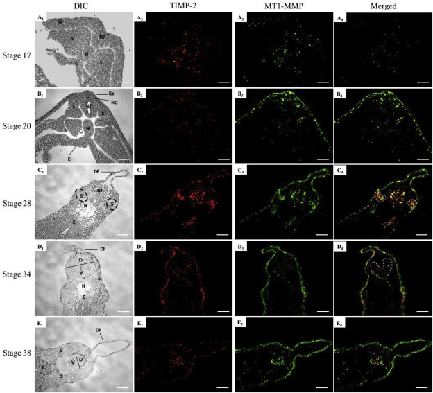 Fig. 3. Localization of TIMP-2 and MT1-MMP proteins during early X. laevis development. Immunohistochemistry was performed using Alexa Fluor 555-labeled anti-TIMP-2 (red) and Alexa Fluor 488-labeled anti MT1-MMP (green) antibodies on stage 17â38 embryos. Brightfield DIC images are shown on the left panels. Mono-colour images for TIMP-2 and MT1-MMP are presented individually. Colocalization of TIMP-2 and MT1-MMP (yellow) is indicated on the right panels. Dotted line in stage 28 merged image indicates overlapping signal within the middle of somites. Dashed line in stage 34 merged image indicates overlapping signal along the ventral neural tube. Scale barâ¯=â¯100 μm. Abbreviations: Eâ¯=â¯endoderm, Epâ¯=â¯epidermis, Dâ¯=â¯dorsal NT, DFâ¯=â¯dorsal fin, Nâ¯=â¯notochord, NCâ¯=â¯neural crest, NPâ¯=â¯neural plate, NTâ¯=â¯neural tube, Sâ¯=â¯somitic mesoderm, Vâ¯=â¯ventral NT.