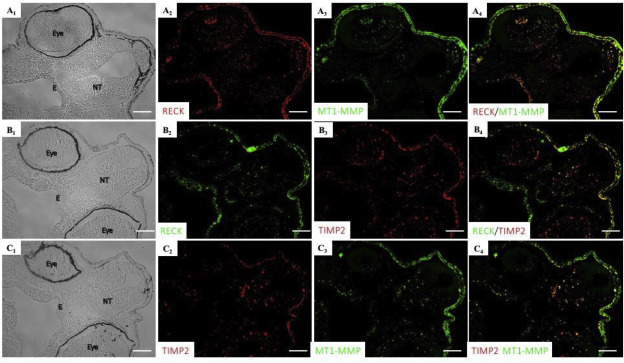 Fig. 4. Localization of RECK, MT1-MMP, and TIMP-2 proteins in the anterior region of stage 38 X. laevis embryos. Immunohistochemistry was performed using Alexa Fluor 555-labeled anti-RECK and anti TIMP-2 (red) and Alexa Fluor 488-labeled anti-MT1-MMP and anti-RECK (green) antibodies on stage 38 embryos. Brightfield DIC images are shown on the left panels. Mono-colour images for RECK, MT1-MMP, and TIMP-2 are presented individually. Colocalization of RECK and MT1-MMP, RECK and TIMP-2, or TIMP-2 and MT1-MMP (yellow) is indicated on the right panels. Scale barâ¯=â¯100â¯Î¼m. Abbreviations: Eâ¯=â¯endoderm, NT=Neural tube.