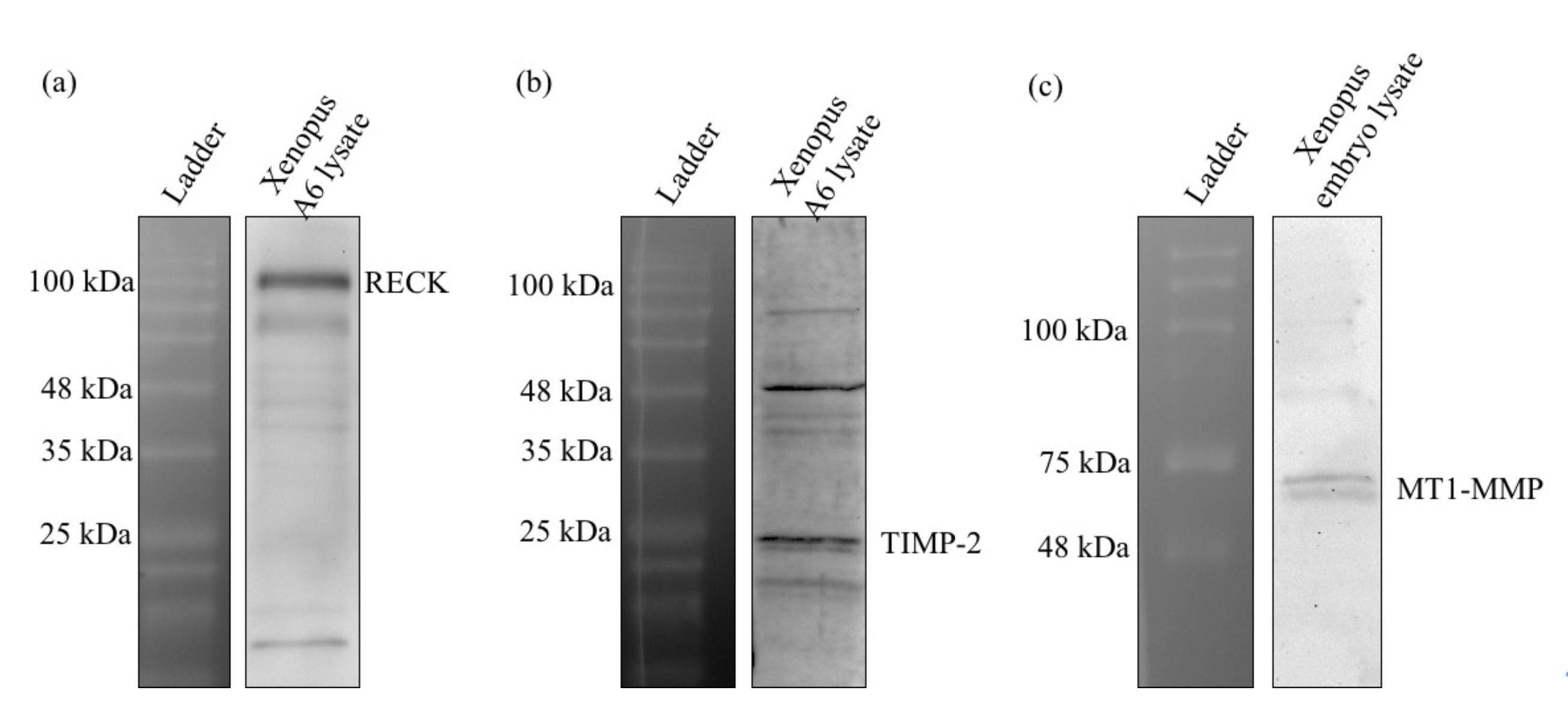 Supplementary Fig. 3 Validation of Antibodies: (a) A blot probed with human rabbit anti-RECK shows a specific band at the expected molecular weight (110 kDa) in Xenopus A6 cell lysate. (b) A blot probed with human mouse anti-TIMP-2 shows a specific band at the expected molecular weight (21 kDa) in Xenopus A6 cell lysate. (c) A blot probed with human rabbit anti-MT1-MMP shows a specific band at the expected molecular weight (65 kDa) in Xenopus whole embryo lysate