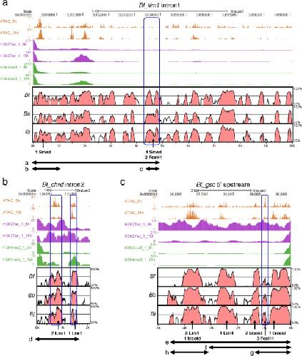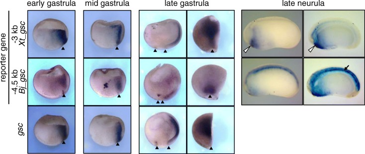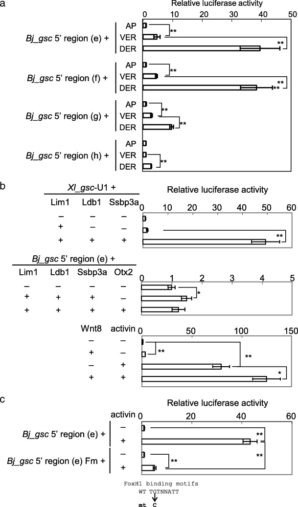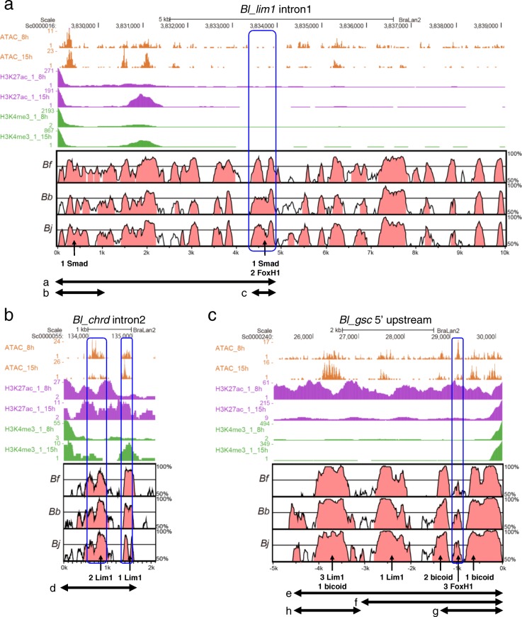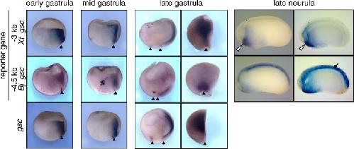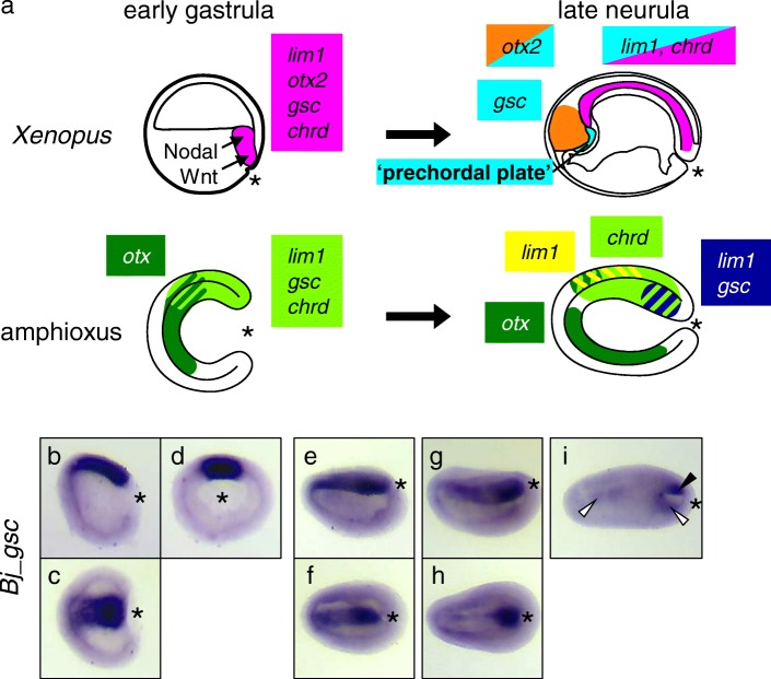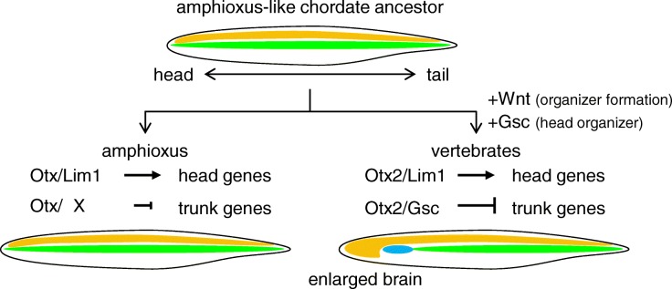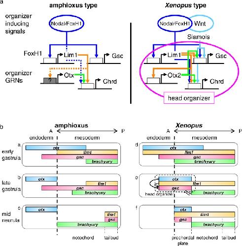 BACKGROUND: In cephalochordates (amphioxus), the notochord runs along the dorsal to the anterior tip of the body. In contrast, the vertebrate head is formed anterior to the notochord, as a result of head organizer formation in anterior mesoderm during early development. A key gene for the vertebrate head organizer, goosecoid (gsc), is broadly expressed in the dorsal mesoderm of amphioxus gastrula. Amphioxus gsc expression subsequently becomes restricted to the posterior notochord from the early neurula. This has prompted the hypothesis that a change in expression patterns of gsc led to development of the vertebrate head during chordate evolution. However, molecular mechanisms of head organizer evolution involving gsc have never been elucidated. RESULTS: To address this question, we compared cis-regulatory modules of vertebrate organizer genes between amphioxus, Branchiostoma japonicum, and frogs, Xenopus laevis and Xenopus tropicalis. Here we show conservation and diversification of gene regulatory mechanisms through cis-regulatory modules for gsc, lim1/lhx1, and chordin in Branchiostoma and Xenopus. Reporter analysis using Xenopus embryos demonstrates that activation of gsc by Nodal/FoxH1 signal through the 5' upstream region, that of lim1 by Nodal/FoxH1 signal through the first intron, and that of chordin by Lim1 through the second intron, are conserved between amphioxus and Xenopus. However, activation of gsc by Lim1 and Otx through the 5' upstream region in Xenopus are not conserved in amphioxus. Furthermore, the 5' region of amphioxus gsc recapitulated the amphioxus-like posterior mesoderm expression of the reporter gene in transgenic Xenopus embryos. CONCLUSIONS: On the basis of this study, we propose a model, in which the gsc gene acquired the cis-regulatory module bound with Lim1 and Otx at its 5' upstream region to be activated persistently in anterior mesoderm, in the vertebrate lineage. Because Gsc globally represses trunk (notochord) genes in the vertebrate head organizer, this cooption of gsc in vertebrates appears to have resulted in inhibition of trunk genes and acquisition of the head organizer and its derivative prechordal plate.