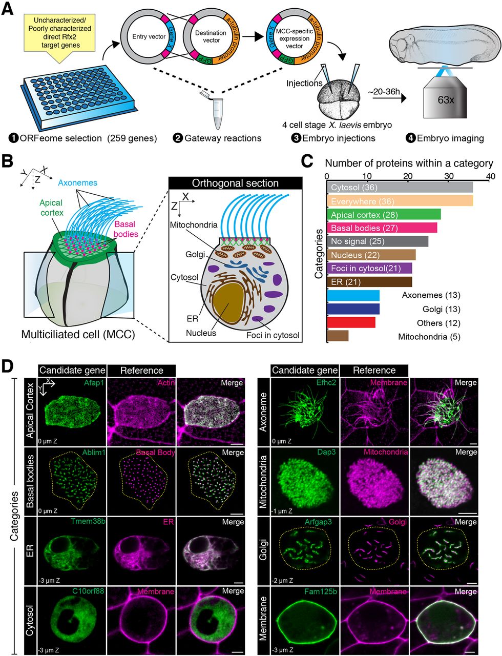Fig. 1. High-content screening of protein localization in MCCs in vivo. (A) Schematics of the screening pipeline; see Materials and Methods for details. (B) Schematics of MCC subcellular structures, indicating the major distinct subcellular structures identified in our screen. (C) Summary of screening results. Out of 259 candidates, 198 showed detectable signal localized to distinct subcellular structures, as categorized on the histogram. (D) Representative localizations of screened Rfx2 targets. Left columns, expression patterns of selected genes; middle columns, expression patterns of reference genes. Afap1 localizes to the actin cortex (marked by LifeAct–RFP), Efhc2 to axonemes (marked by CAAX–RFP), Ablim1 to basal bodies (marked by Centrin2–BFP), Dap3 to mitochondria (marked by mito-RFP), Tmem38b to ER (marked by Cal–BFP-KDEL), Arfgap3 to the Golgi (marked by GalT–RFP), C10orf88 to cytosol, and Fam125b to the basolateral membrane (marked by CAAX–RFP). Numbers at the bottom-left corner indicate the z-plane position in reference to the apical domain (0 µm z). Scale bars: 5 μm. The yellow dotted line outlines the cell boundary of MCC. |