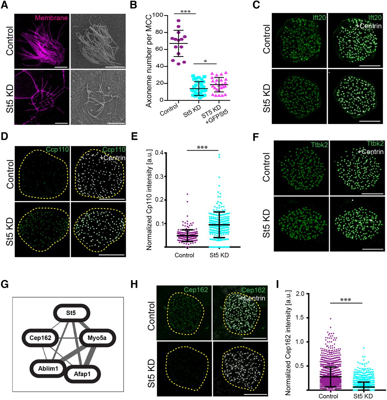 Fig. 4. St5 is required for ciliogenesis. (A) Perturbation of St5 disrupted ciliogenesis. Left panel, axonemes visualized by CAAXâRFP, magenta. Right panel, SEM of a control MCC and MCC upon St5 knockdown (KD). Scale bars: 10â µm. (B) The axoneme number per MCC was significantly reduced from 67.1±15.4 in controls to 14.0±8.2 in St5 KD (***P<0.001, MannâWhitney U-test; Control, n=14 cells; St5 KD, n=32 cells; N>5 embryos). The number of axonemes was increased by rescue expression of GFPâSt5 with an α-tubulin promoter to 18.6±8.5 (*P<0.05, MannâWhitney U-test; St5 KD with GFPâSt5, n=25 cells, N>5 embryos). Data represent mean±s.d. (C) St5 KD did not disrupt the recruitment of Ift20 (IftâGFP, green). Scale bars: 10â µm. (D) St5 KD increases the level of GFPâCp110 (green) at basal bodies (marked by Centrin2âRFP, white). Scale bars: 10â µm. (E) The normalized Cp110 intensities around basal bodies increased from 0.046±0.045 to 0.093±0.098. (***P<0.001, MannâWhitney U-test; Control, n=1430 intensities from eight cells; St5 KD, n=1413 from 10 cells; N>5 embryos). Data represent mean±s.d. (F) St5 is dispensable for Ttbk2 recruitment. GFPâTtbk2 showed ring shape structures in both control and St5 KD cells. (G) Network of St5-containing protein complex predicted by assembled map of human protein complexes (Drew et al., 2017). Line weights represent support vector machine confidence scores. (H) The level of Cep162âGFP (green) at basal bodies (marked by Centrin2âRFP, white) was decreased upon St5 KD. Scale bars: 10â µm. (I) The normalized Cep162 intensities around basal bodies decreased from 0.28±0.21 to 0.07±0.10. (***P<0.001, MannâWhitney U-test; Control, n=1734 intensities from 10 cells; St5 KD, n=1710 from 13 cells; N>5 embryos). Data represent mean±s.d. The yellow dotted lines in D and H outline the cell boundary of MCCs. |