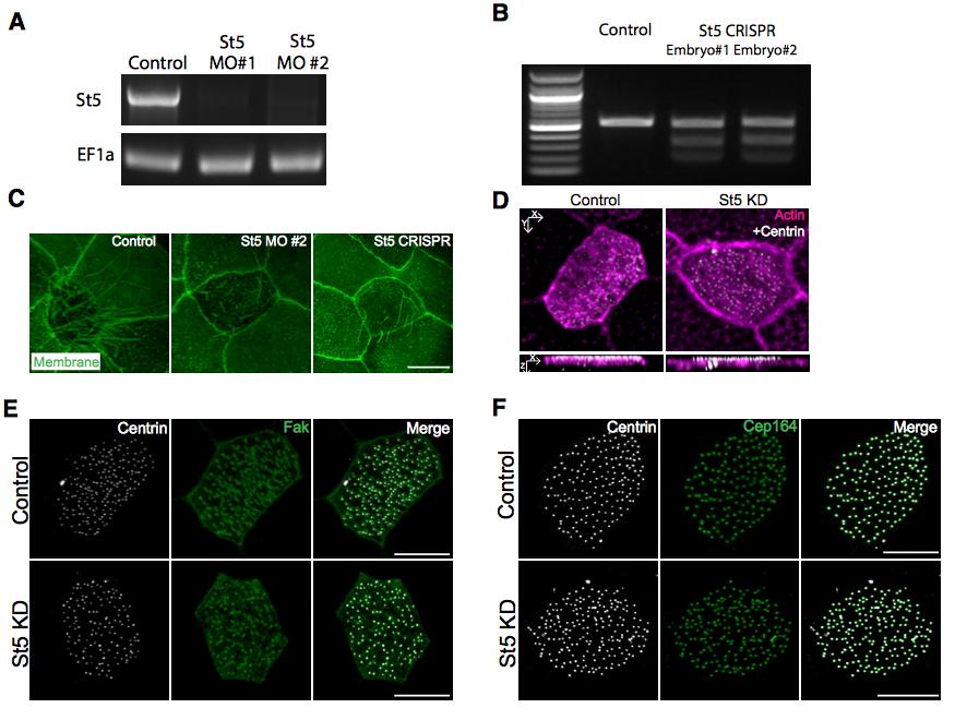 Figure S2. St5 KD and KO show similar axonemogenesis defect phenotype but St5 is not required for recruitment of Cep164 and Fak. (A) The levels of St5 transcripts were significantly reduced by injection of St5 morpholino compared with control. EF1a, input reference. (B) T7 Endonuclease I (T7EI) assay showed St5 CRISPR induced genomic mutations in St5 (C) St5 MO#2 and St5 CRISPR led to similar axonemogenesis defects as St5 MO#1. (D) St5 KD did not disrupt basal body docking. (E) St5 KD did not disrupt the recruitment of Fak (Fak-GFP, green). Scale bar, 10 μm. (F) St5 KD did not disrupt the transition zone marked by Cep164(GFP-Cep164, green). Scale bar, 10 μm. |
