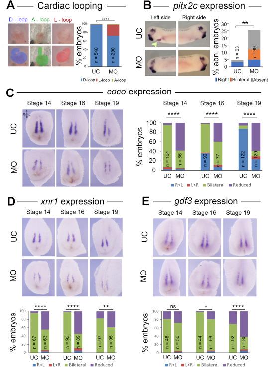 Fig. 1. agmo is required for L-R development. A) Depletion of Agmo disrupts cardiac looping. Lower images are pseudo-colored to highlight cardiac looping. B) Expression of pitx2c, which is normally only in left side mesoderm (upper row), is impaired in Agmo morphants (typically absent, lower row). abn.; abnormal C) coco expression is greatly reduced in the LRO from early in its development (before the initiation of flow, stage 14). LROs are dissected out and imaged ventrally. A; anterior, P; posterior, L; left, R; right. D) Expression of xnr1 and E) gdf3 is reduced in the left â right organizer of agmo morphants. Figure shows three developmental stages: stage 14 (pre-directional fluid flow) and stage 16 and 19. Graphs represent the combined results of six independent experiments for cardiac looping and xnr1, three repeats for pitx2, five repeats for coco, and 3 independent repeats for gdf3. UC; uninjected control, MO; morphant, ns; non-significant, *p â< â0.05, **p â< â0.01, ****p â< â0.0001 by Chi-square analysis. |