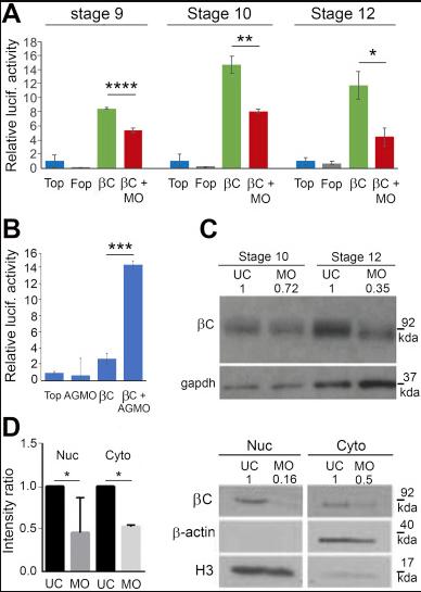 Fig. 3. agmo mediates canonical Wnt signaling. A) TOPflash assays reveal that Wnt driven luciferase production is reduced in agmo morphants throughout gastrulation (stages 9, 10, 12). B) Injection of agmo mRNA alone had no significant effect on luciferase activity, while co-injection of agmo mRNA and β-catenin mRNA increased Wnt activity significantly relative to injection of β-catenin alone. In A and B 10 embryos were pooled in each condition, and graphs represent the combined results of three biological and technical replicates. C) β-catenin protein levels are reduced in morphants at stage 10 and 12 as assayed by Western blot. D) Western blot analysis reveals that β-catenin protein levels are reduced in both the cytoplasmic (Cyto) and nuclear (Nuc) fractions of agmo morphants. The graph represents the combined result of four independent experiments. AGMO, AGMO mRNA; Top, TOPFlash reporter plasmid; Fop, FOPFlash negative control; BC, TOPFlash reporter plasmid + β-catenin mRNA; BC â+ âMO, TOPFlash reporter plasmid + β-catenin mRNA â+ âagmo morpholino; UC, uninjected control. All error bars represent â± âsd. *p â< â0.05, **p â< â0.01, ***p â< â0.001, ****p â< â0.0001 determined by students T-test. |
