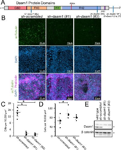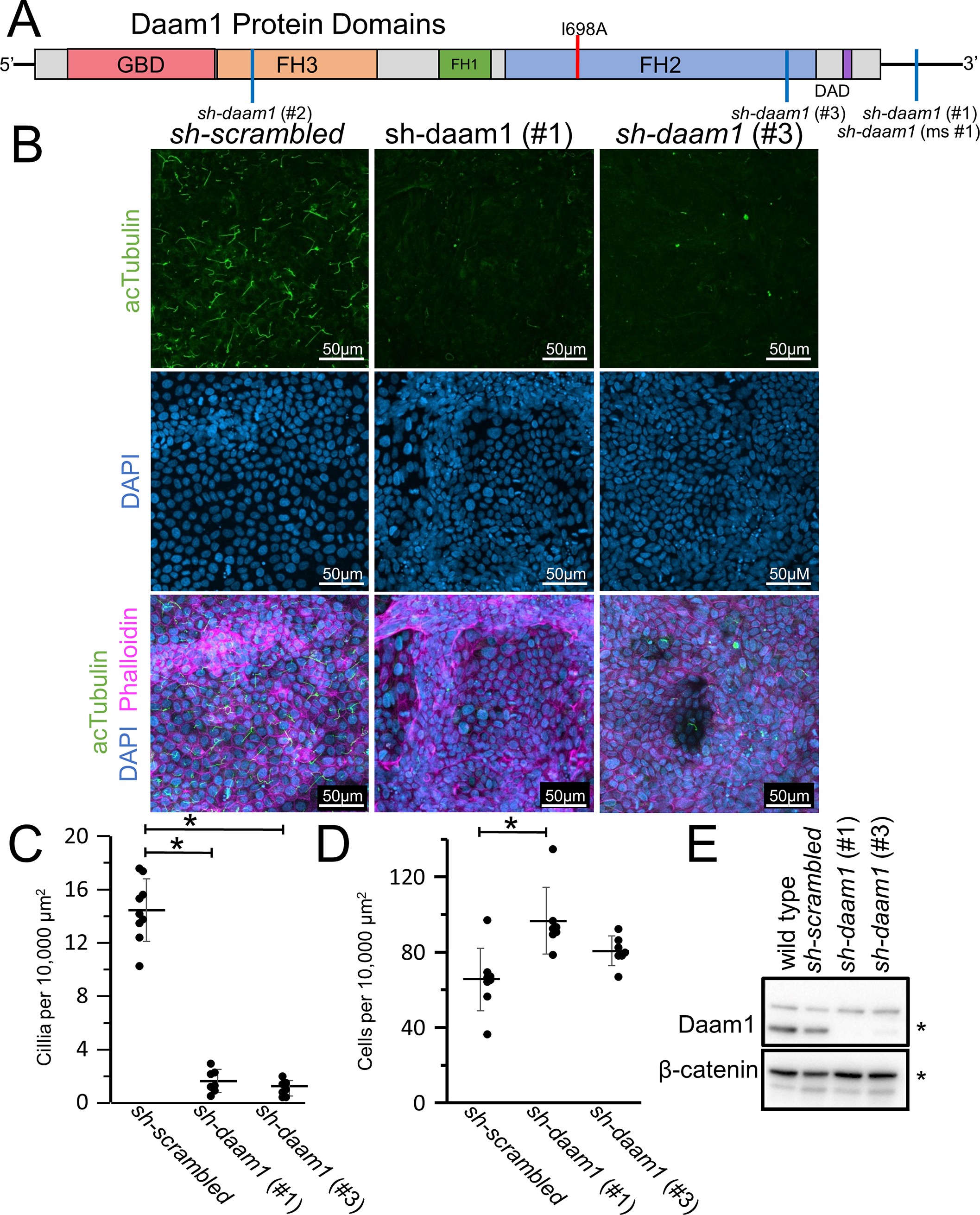 Fig 1. Daam1 knockdown results in a loss of primary cilia in MDCKII cells. A) Diagram illustrating the domains within the Daam1 protein. The GBD (DiaphanousGTPase-binding Domain), FH3 (Diaphanous FH3 Domain), FH1 (Formin Homology 1), FH2 (Formin Homology 2) and DAD (Diaphanous Auto-regulatory Domain) are indicated. The location of the I698A mutation within the formin homology 2 domain (FH2) is marked with a red line, and positions corresponding to the shRNAs are marked with a blue line. MDCKII canine kidney epithelial cells were infected with either sh-daam1 or a control construct and grown upon transwell filters. B) Cells were stained with acetylated α-Tubulin antibody (acTubulin) to visualize primary cilia (green), DAPI to label nuclei (blue), and phalloidin to label F-actin (magenta). Confocal imaging was used to analyze the effect of Daam1 depletion on primary ciliogenesis. Scale bars equal to 50 μm. C) Cilia were quantified. Error bars are shown as ± SD and black dots indicate value of each image quatified. D) Cell numbers were quantified as described in S5 Fig. Error bars are shown as ± SD and black dots indicate value of each image quatified. E) Western blot of sh-daam1 MDCKII cell lysates showing depletion of Daam1 protein levels. β-catenin was used as a loading control. * indicates p < 0.05 as compared to sh-scrambled using two tailed t test. |