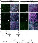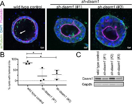 Fig 2. sh-daam1 depleted MDCKII cells show reduced luminal ciliogenesis in 3D cultures. Control and sh-daam1-depleted cells were cultured in collagen I matrix to form cysts. After 12â14 days in culture, cysts were fixed and stained with an antibody against acetylated α-Tubulin (acTubulin) to visualize primary cilia (green), phalloidin for F-actin (magenta) and DAPI for nuclei (blue). Using confocal imaging we analyzed the effect of Daam1 depletion on ciliogenesis. A) Representative merged confocal images showing reduction of luminal cilia upon Daam1 knockdown. White arrow points to luminal cilia in control cysts. Scale bars equal to 10 μm. B) The graph shows quantification of cysts with luminal cilia for each condition. Twenty randomly chosen cyst per sample were analyzed in three independent experiments. Error bars are shown as ± SD; Significance was calculated using unpaired, two-tailed t-test; ns indicates p > 0.05, * indicates p < 0.05, **p < 0.01 C) Western blot showing Daam1 protein levels in wild-type (control) cells and in cells expressing different shRNAs targeting Daam1. GAPDH was used as loading control. |