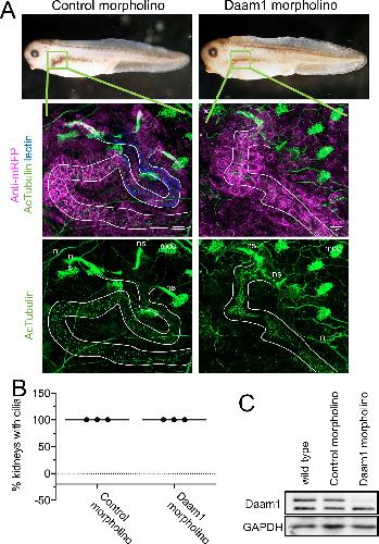 Fig 6. Daam1-depletion does not cause absence of cilia within Xenopus embryonic kidneys. Because knockdown of Daam1 in Xenopus kidney leads to kidney defects, we analyzed the effect of Daam1 knockdown on renal ciliogenesis. We injected Daam1 or Standard (Control) morpholino in combination with a membrane-tagged red fluorescent protein (mRFP) mRNA as a lineage tracer, into a Xenopus blastomere fated to the nephric anlagen. Embryos were fixed at stage 39â40 and stained with an antibody against acetylated α-Tubulin (acTubulin) to label cilia (green), anti-mRFP lineage tracer (magenta) and lectin to label the proximal tubule (blue). A) Stereoscope brightfield imaging shows the gross morphology of Control and Daam1-morpholino injected embryos. Confocal fluorescent imaging of boxed regions (green) shows magnified views of corresponding kidneys. Kidney tubules displaying primary cilia are outlined in white. Neurons (n), multiciliated epidermal cells (mcc) and multiciliated cells within nephrostomes (ns) are immunostained with acetylated α-Tubulin (acTubulin) antibody. Scale bars equal to 20 μm. B) The graph represents the percentage of Control (n = 32 embryos) and Daam1-depleted (n = 34 embryos) kidneys with primary cilia. C) Western blot showing Daam1 protein expression levels in uninjected wild-type, control and Daam1 morphant embryos. |