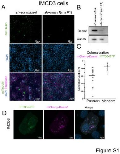 Fig 4. Daam1 localizes to ciliary vesicles and cilia. A) MDCKII cells were co-transfected with constructs that express mCherry-Daam1 and GFP-Daam1(I698A) then imaged via confocal to analyze the localization in live cells. B) MDCKII cells were co-transfected with constructs that express mCherry-Daam1 and Ift88-GFP than imaged via confocal in live cells to determine the subcellular localization. Scale bars equal to 10 μm. C) MCDKII Cells were transfected with mCherry-Daam1 along with GFP, GFP-Ift88, or GFP-Daam1(I698A), then colocalization was measured using both the Pearson and Manders equations. Error bars are shown as ± SD and black dots indicate colocalization value for each cell measured. D) Wildtype and sh-daam1 (#1) cells were cells were ciliated, fixed, then stained for Daam1 (Proteintech) and acTubulin (Sigma). E) MDCKII cells were subconfluently grown then fractionated for subcellular components. âTotalâ indicates whole cells lysated isolated prior to fractionation. Lysates were ran on Western blot and probed for Daam1, secretory components (Rab11), ciliary vesicles (Ift88), and cytoplasmic + vescular components (GAPDH). F) Cilia was isolated from IMCD3 cells and lysates were ran on a Western blot. âTotalâ indicates whole cell lysated isolated prior to deciliation. The blot was probed for the Daam1, a ciliary marker Ift88, and a cellular marker GAPDH. |