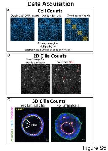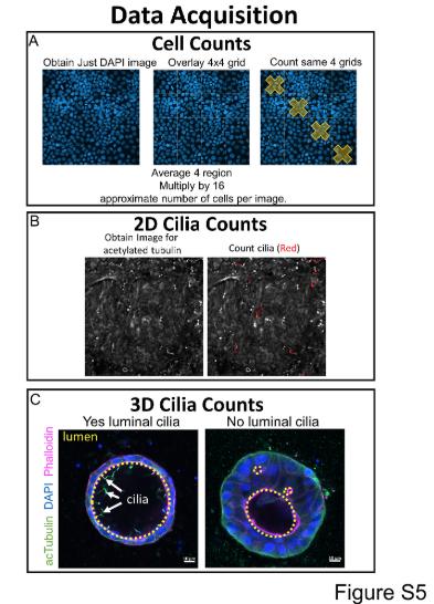 S5 Fig. Quantification methodology. A) To obtain unbiased quantitation of cell numbers in MDCKII depletion experiments (Figs 1 and 5), DAPI images were divided into a 4 x 4 grid. Nuclei were counted within the 4 indicated and the number of cells was averaged. This number was multiplied by 16 to obtain the approximate number of cells per image. B) Cilia labeled with using acetylated Lys40 tubulin antibody were counted manually. All cilia within an image were counted as shown in red. C) The lumen of 3D cysts were scored either for presence or absence of cilia. The lumens of cysts are marked with yellow dashed lines. |