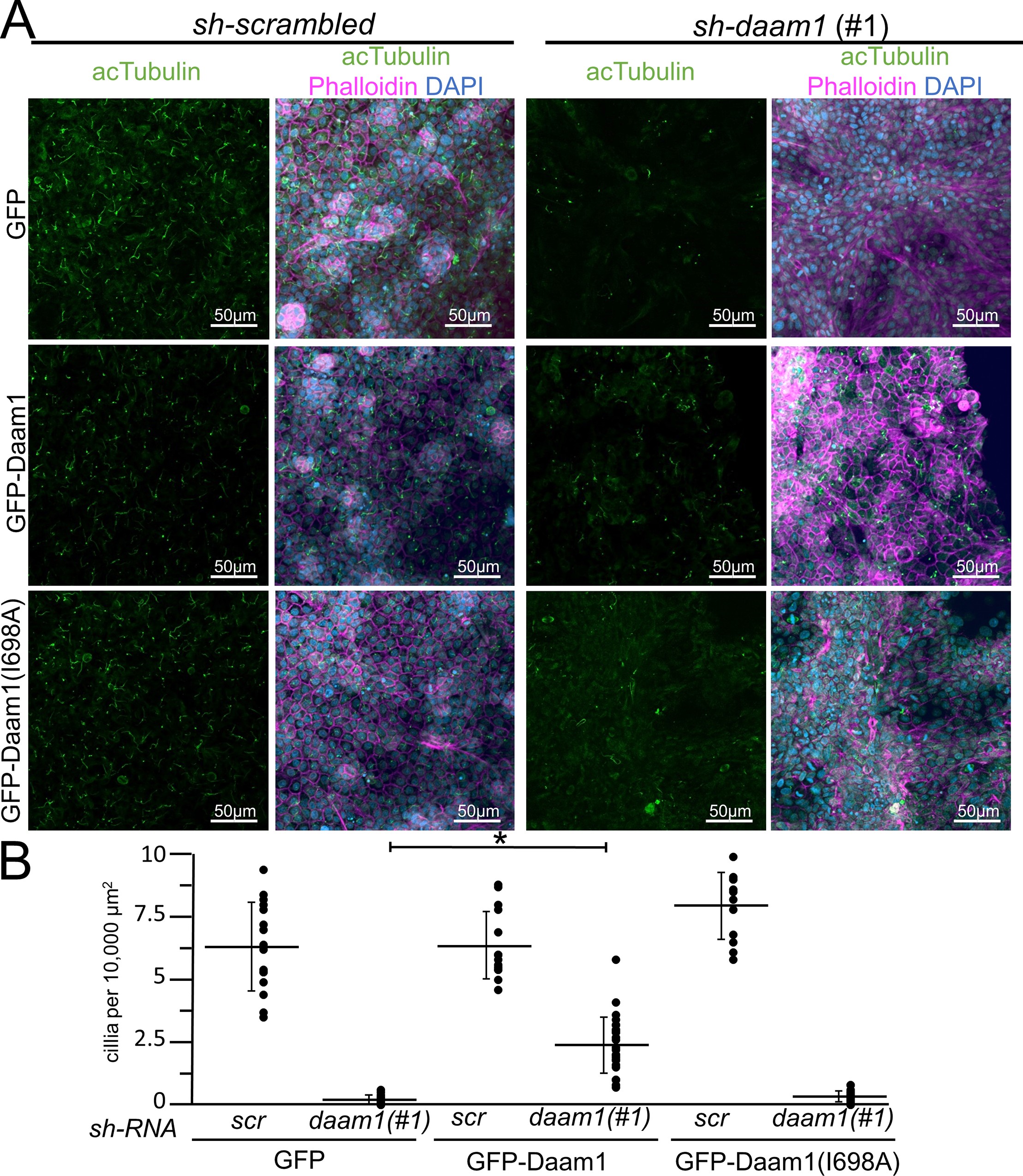 Fig 3. The sh-daam1 cilia phenotype can be rescued with wild-type Daam1 but not Daam1(I698A). Stable MDCKII cells infected with either sh-daam1 or a control sh-scrambled construct were transiently transfected with constructs that express either GFP, GFP-Daam1, or GFP-Daam1(I698A) constructs. Cells were grown on transwell filters and stained with acetylated α-Tubulin antibody (acTubulin) to label primary cilia (green), DAPI to label nuclei (blue), and phalloidin to label F-actin (Magemta). Confocal imaging was used to analyze the effects upon primary ciliogenesis. A) Representitive images of ciliated cells stained with acetylated tubulin (green), dapi (blue) and phalloidin (magenta). Scale bars equal to 50 μm. B) Quantification of the amount of ciliation. Error bars are shown as ± SD. Black dots indicate individual values for each image quantified. * indicates p < 0.05 as compared to sh-scrambled using two tailed t test. |