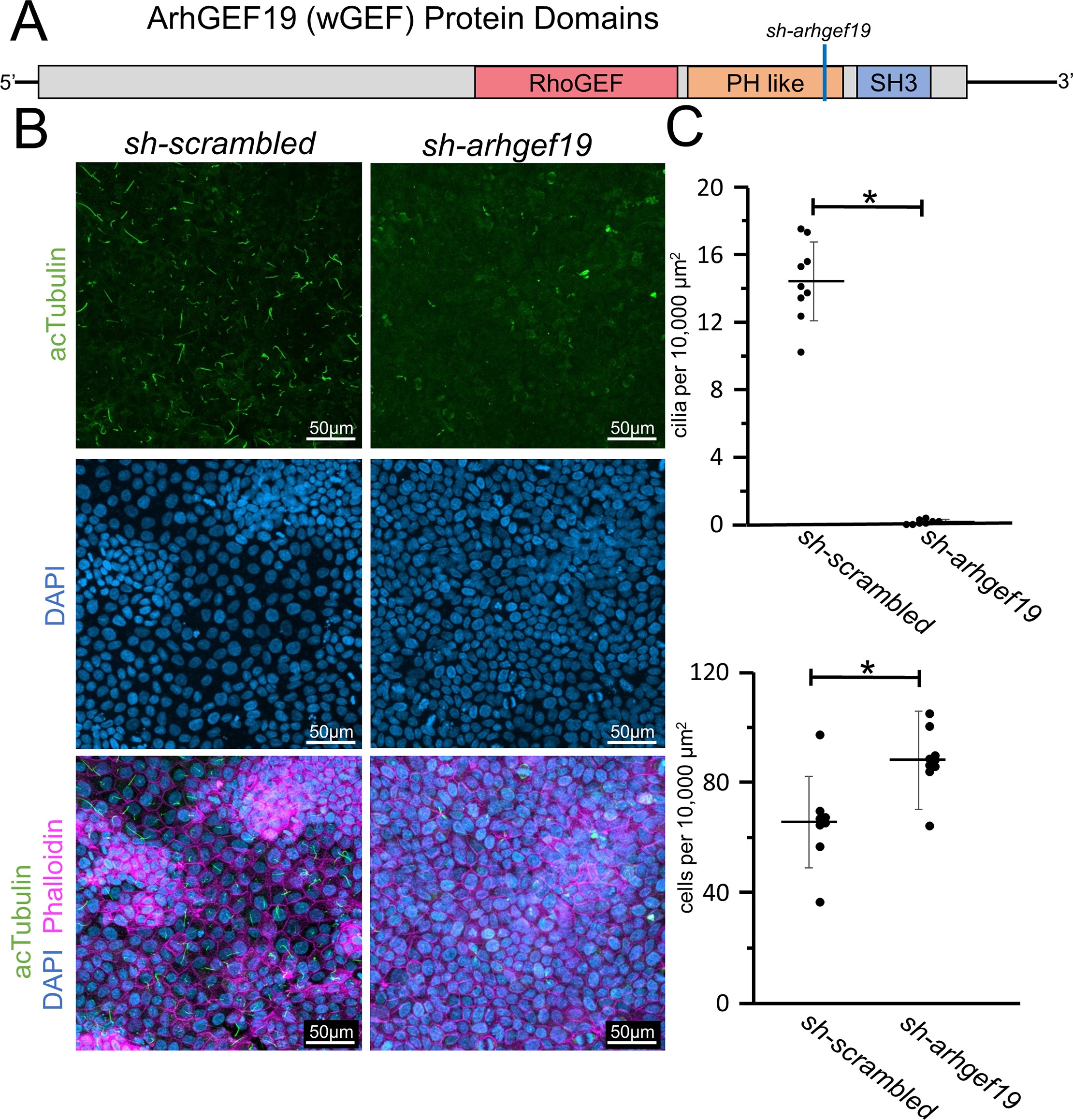 Fig 5. Arhgef19 knockdown results in loss of primary cilia in MDCKII cells. A) Diagram of the domains within the Arhgef19 (WGEF) protein. The corresponding position of the shRNA is marked with a blue line. B) MDCKII cells were infected with either a control construct or a construct that targets Arhgef19 and then polarized on transwell filters. Cells were stained with acetylated α-Tubulin antibody (acTubulin) to visualize primary cilia (green), DAPI to label nuclei (blue), and phalloidin to label F-actin (magenta). Confocal imaging was used to analyze the effects Arhgef19 depletion upon primary ciliogenesis. Scale bars equal to 50 μm. C) The number of cilia was counted and cell numbers were quantified as described in S5 Fig. * indicates p < 0.05 as compared to sh-scrambled. Error bars are shown as ± SD and black dots indicate value of each image quatified. |