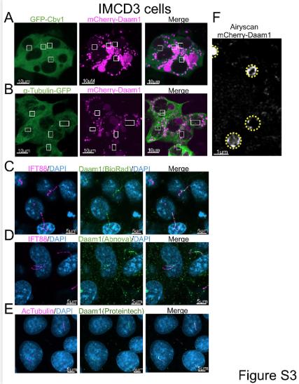 S3 Fig. Daam1 localiation at cilia and vesicles. A-B) Murine inner medullary collecting duct (IMCD3) cells were transfected with mCherry-Daam1 along with either Cby1-GFP or α-Tubulin-GFP. Cells were grown to confluency and serum starved to ciliate. Then cells were analyzed via confocal for colocalization of Daam1 and these ciliary markers. White boxes outline the ciliary transition zone in Cby images and cilia in α-Tubulin images. Scale bars equal to 10 μm. C-D) IMCD3 cells were ciliated fixed with glyoxal then stained for Ift88 and Daam1 using two diferent Daam1 antibodies. E) IMCD3 cells transfected with mCherry-Daam1 construct were grown to confluency and puncta were imaged using Airyscan super-resolution system. Vesicles are circled with a yellow dotted line. |