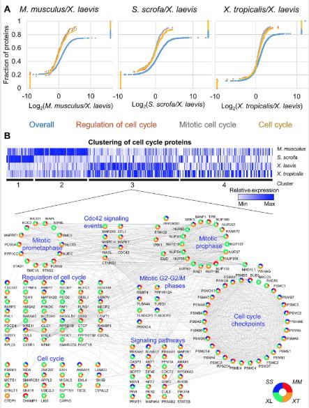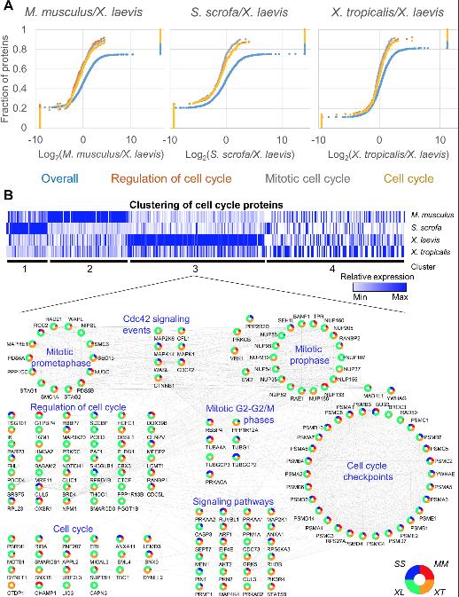 Fig 3. GSEA reveals the increased relative abundance in cell-cycle proteins in Xenopus laevis. (A) Pairwise GSEA was carried out between X. laevis and the 3 other species, revealing an enrichment (adjusted p ≤ 0.05) in cell cycle related proteins in X. laevis. (B) All proteins found in any enriched cell cycle related category by GSEA were clustered using k means (k = 4). Relative protein abundance is shown. The proteins found in cluster 3 were further analyzed in Cytoscape and grouped by function to show the interrelated nature of the proteins enriched in this cluster. See S13 Table and S14 Table for numerical data underlying figure. GSEA, Gene Set Enrichment Analyses. |