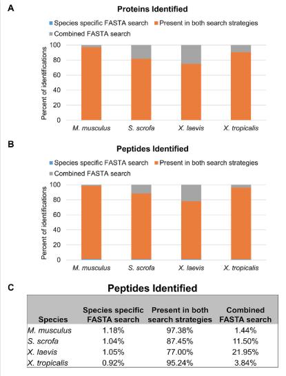 S2 Fig. The combined database search approach yielded an increase in IDs. Percent of (A) proteins and (B) peptides identified uniquely in either a species-specific (blue bars) or combined species (gray bars) search. Orange bars represent proteins and peptides found in both search modes. (C) Table of values from (B). See S2 Table for numerical data underlying figure. ID, Identification. |