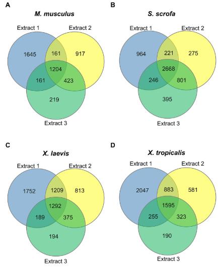 S3 Fig. Total proteins identified. (A) M. musculus, (B) S. scrofa, (C) X. laevis, and (D) X. tropicalis. |