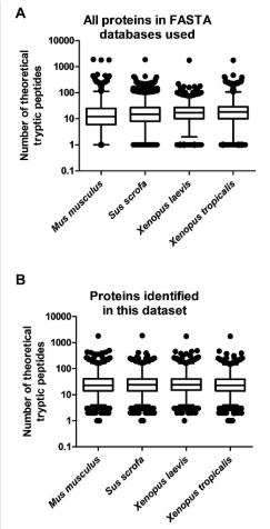S6 Fig. Assessment of tryptic peptide frequency across species. (A) The distribution of theoretical tryptic peptides present in the FASTA databases used in this study was significantly different between all species (p < 0.0001). (B) However, no significant difference in the distribution of theoretical tryptic peptides was observed across the 4 species for the proteins analyzed in this data set. Whiskers show 1 to 99 percentile. See S7 Table for numerical data underlying figure. |