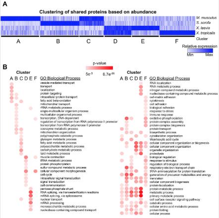 S16 Fig. Analysis of species unique proteins. (A) The proteins uniquely identified in the mammalian and Xenopus species were used to examine evolutionary driven protein expression differences in these organisms using ClueGO (B) Proteins found uniquely in one species only were combined with the cluster of proteins that were more highly expressed in that species and analyzed for overrepresentation of GO biological process terms. The p-values of the significantly enriched terms are shown in a heat map. See S12 Table for numerical data underlying figure. GO, Gene Ontology. |