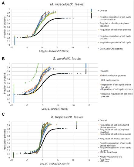 S18 Fig. Gene duplication corrected cell-cycle analysis. Data from Fig 3 were reproduced here with correction for gene duplication in X. laevis. Similar trends were observed as before. See S15 Table for numerical data underlying figure. |