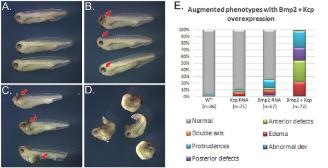 Fig. S22 Kcp augments BMP signaling. (A) Control embryos; mock injected. (B) Embryos injected with 500 pg Kcp mRNA. Embryos display protrusions (red arrows). (C) Embryos injected with 500 pg Bmp2 mRNA. Embryos displaying partial double axis (red arrows). (D) Embryos injected with 500 pg Kcp mRNA + 500 pg Bmp2 mRNA. Embryos displaying partial double axis, posterior truncations, edema. (E) Graph of the classes of phenotypic abnormalities in wild-type embryos verses those injected with Kcp alone, BMP2 alone, or BMP2 + Kcp. Results from 2 independent biological replicates with total number of embryos scored under each heading. See S17 Table for numerical data underlying figure. BMP, bone morphogenetic protein; Kcp, Kielin/chordin-like protein. |