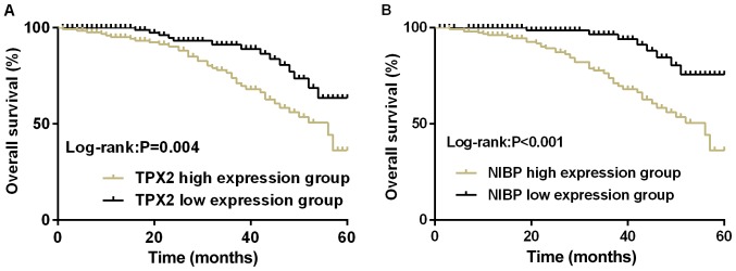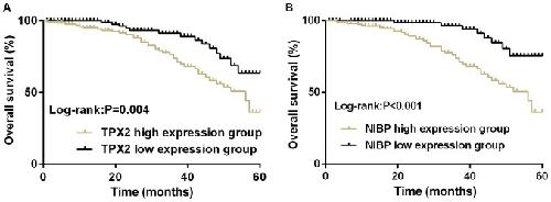 Figure 2. Survival of patients with esophageal cancer. (A) The 5-year overall survival rate of TPX2 high expression group was much lower than that of TPX2 low expression group (P<0.05). (B) The 5-year overall survival rate of NIBP high expression group was much lower than that of NIBP low expression group (P<0.001). TPX2, Xenopus kinesin-like protein 2; NIBP, NIK-IKK-β binding protein.
