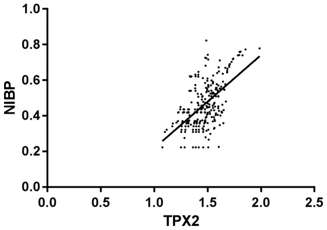 Figure 3. Correlation analysis of TPX2 and NIBP. Pearsons analysis showed that there is a positive correlation between TPX2 expression and NIBP expression in esophageal cancer tissues, with significant difference (P<0.001). TPX2, Xenopus kinesin-like protein 2; NIBP, NIK-IKK-β binding protein.